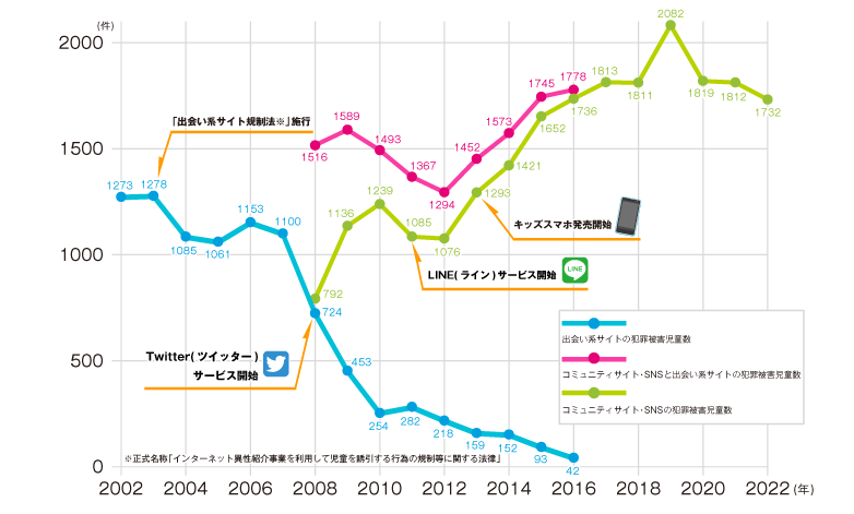 X(エックス※旧Twitter)がサービスを開始した2008年からSNSでのトラブルが急増し、Instagram(インスタグラム)、TikTok(ティックトック)、ひま部(2019年サービス終了)、カカオトーク(2020年MicrosoftStoreAPPからダウンロードできなくなりました)、KoeTomo(声とも)、など新しい子ども向けのサービスや、キッズスマホの登場などが被害増加の一因になっていると考えられます。